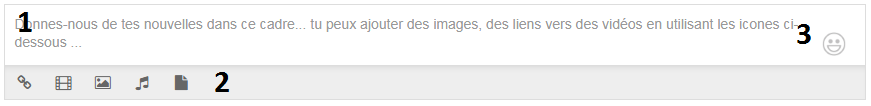 - La zone 2 permet d'ajouter divers objets : lien externe, vidéo, image, musique ou fichier